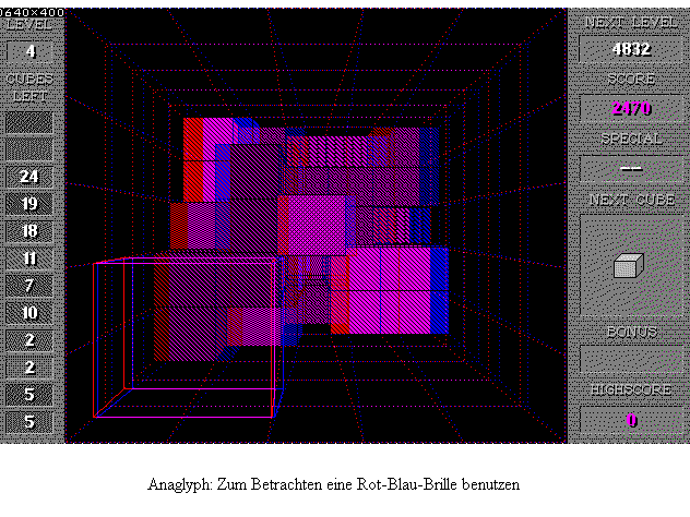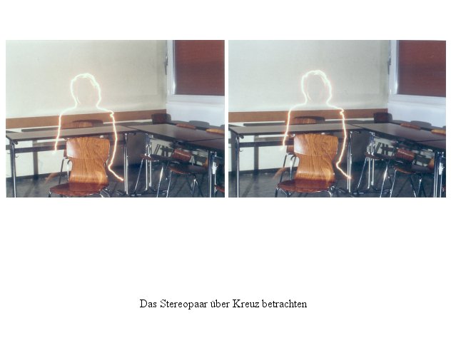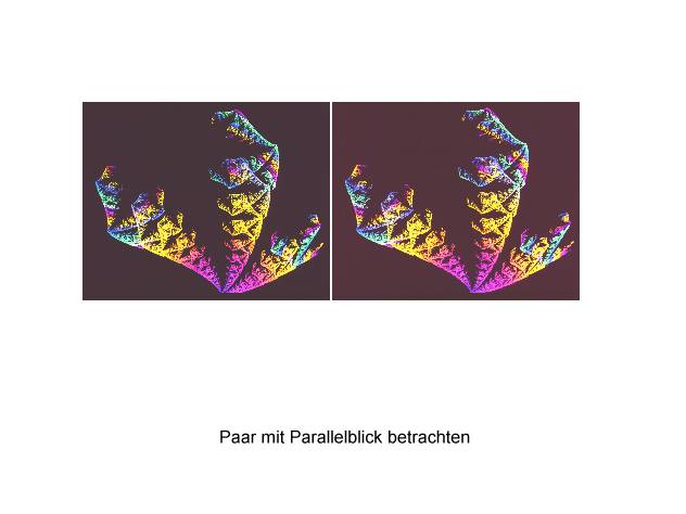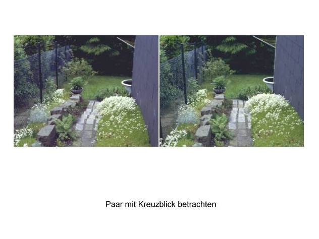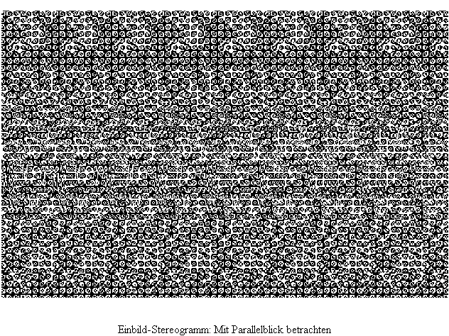 Zum Thema Räumliche Bilder gehört die 3D-Galerie, in der Stereobilder unterschiedlicher Herstellungsart gezeigt werden (unten ein Single-Image-Random-Dot-Stereogram - Parallelblick!). Den räumlichen Eindruck erhalten Sie nur, wenn Sie über die entsprechenden Instrumente oder die nötigen Fähigkeiten verfügen. Das heißt, dass Sie eine Anaglyphenbrille, bzw. den Kreuz- oder Parallelblick anwenden müssen. Im Bild oder im Titel steht ein Hinweis auf die Technik.