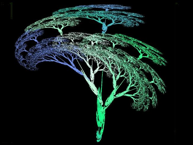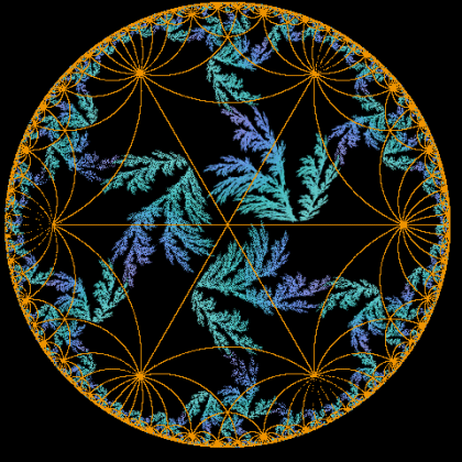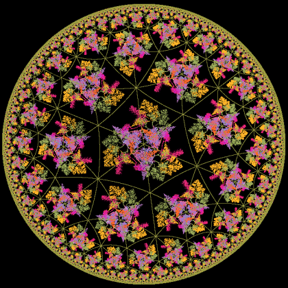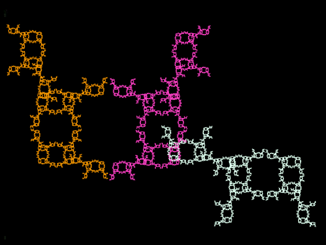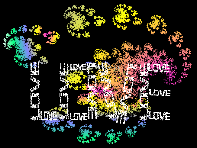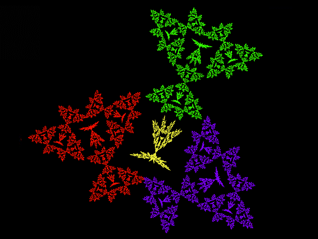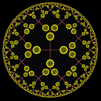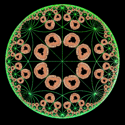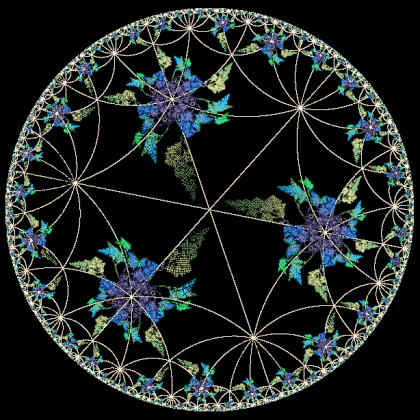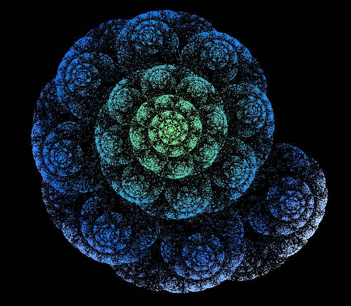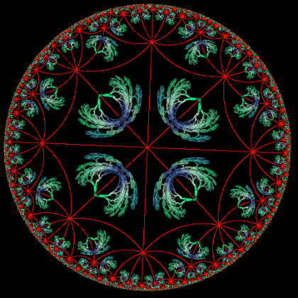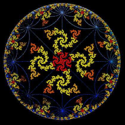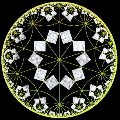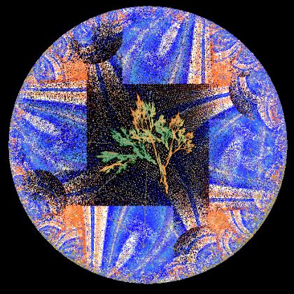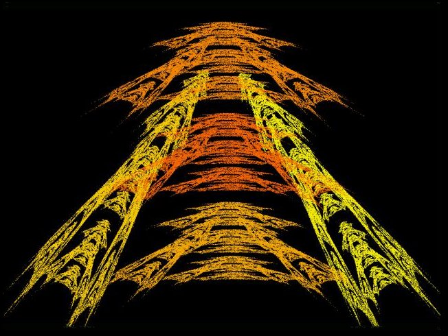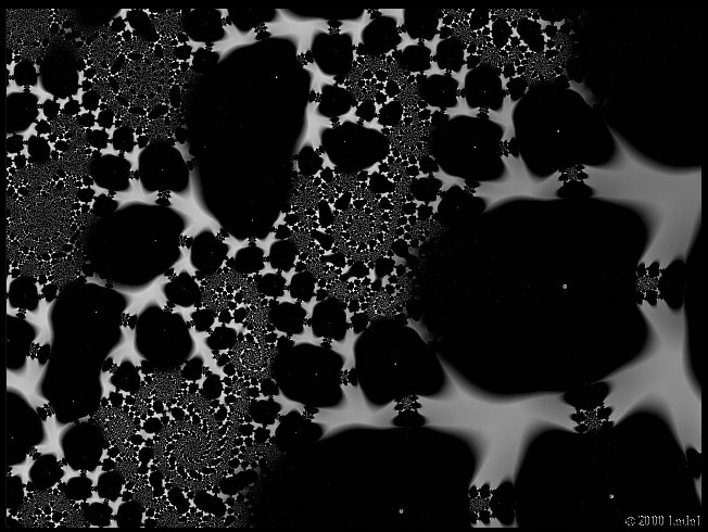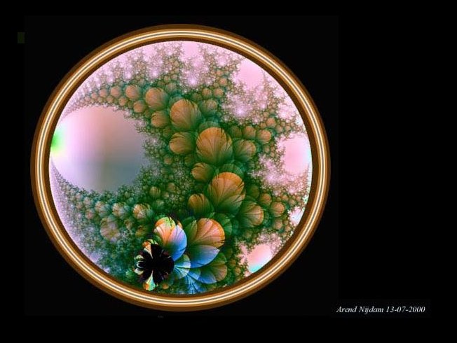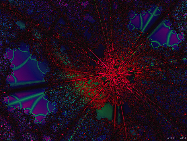 You are in my Fractal Gallery. Here I show the images I like and which I've produced with my own programs or with my camera. There is also a room with images from International Fractal Friends. Free walls in new rooms could be filled with your work. The images are of different fractal types, but you won't find much Mandelbrot-Set pics. I am impressed by the Mandelbrot-Set too, but many galleries are filled with it, so it isn't necessary for me to offer more of those. My favorite type is the IFS-type but I also build Liapunov and Lindenmayer images. Don't miss the Droste Effect. I hope you'll enjoy my images on math and art.