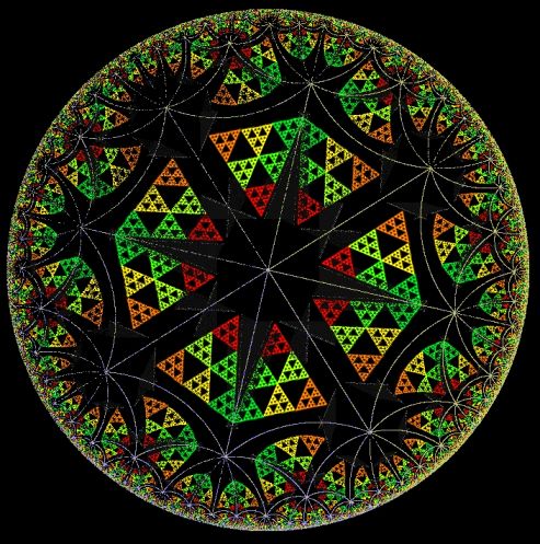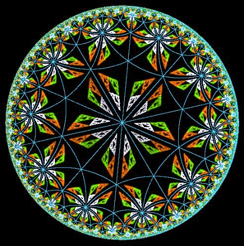 Der niederländische Grafiker M. C. Escher (1898-1972) hat zahlreiche Werke geschaffen, die immer noch starke Beachtung finden und vor allem Freunde der Mathematik ansprechen. Escher wurde durch den befreundeten Mathematiker Harold S. M. Coxeter inspiriert und ein Ergebnis ist eine Reihe von Werken mit den Titeln Kreislimit I - IV. Mathematisch gesehen handelt es sich bei diesen Werken um Hyperbolische Ornamente.
